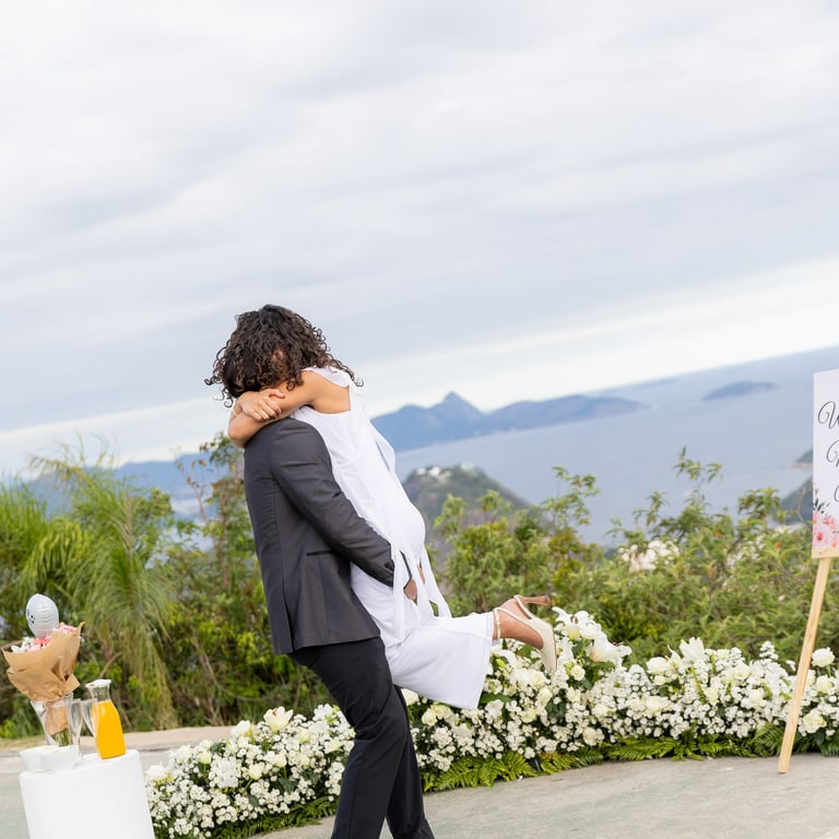 The entire proposal was captured with professional photography, documenting the moment and the incredible view that makes Dona Marta viewpoint one of the most unique places for a marriage proposal in Rio de Janeiro.