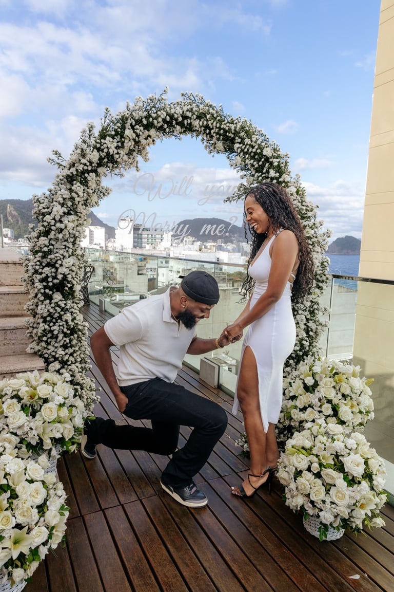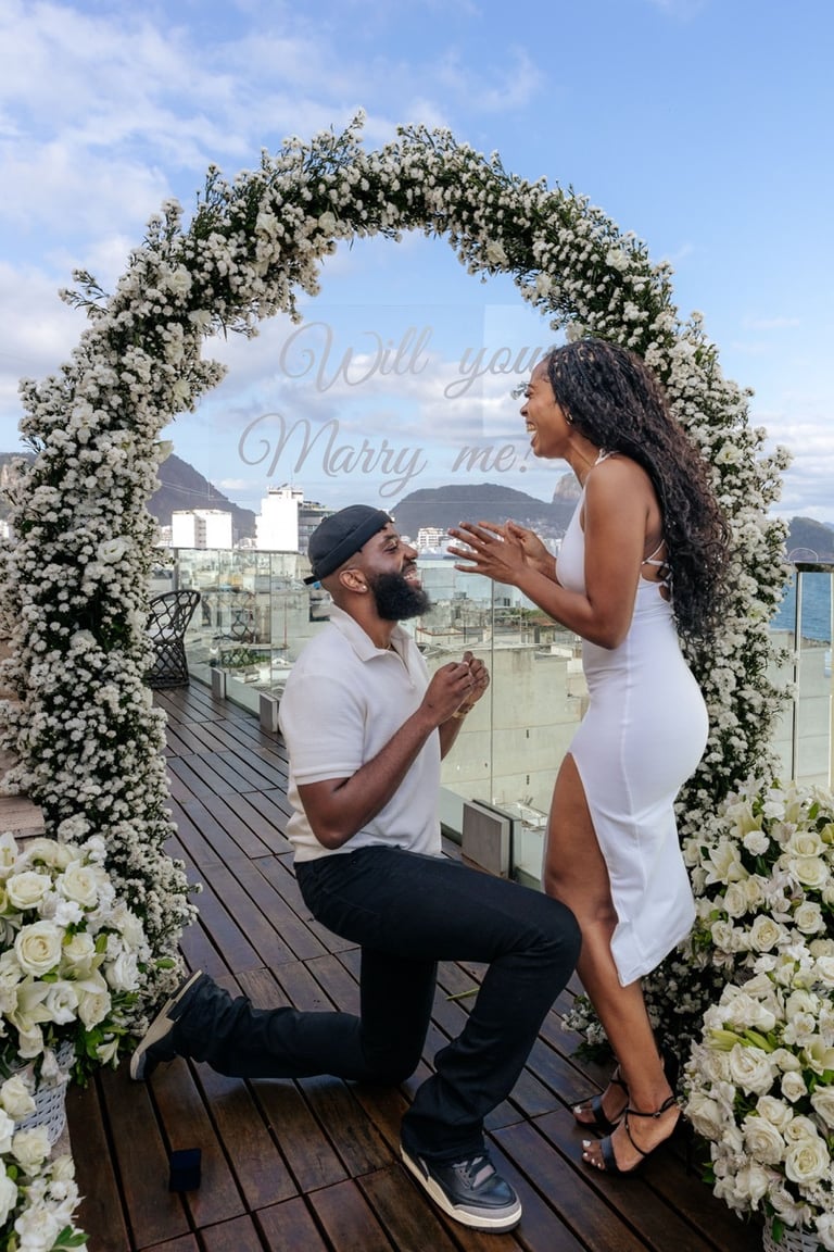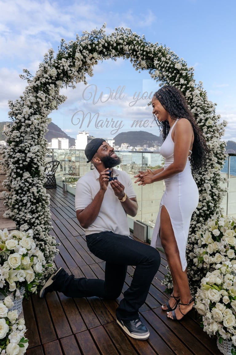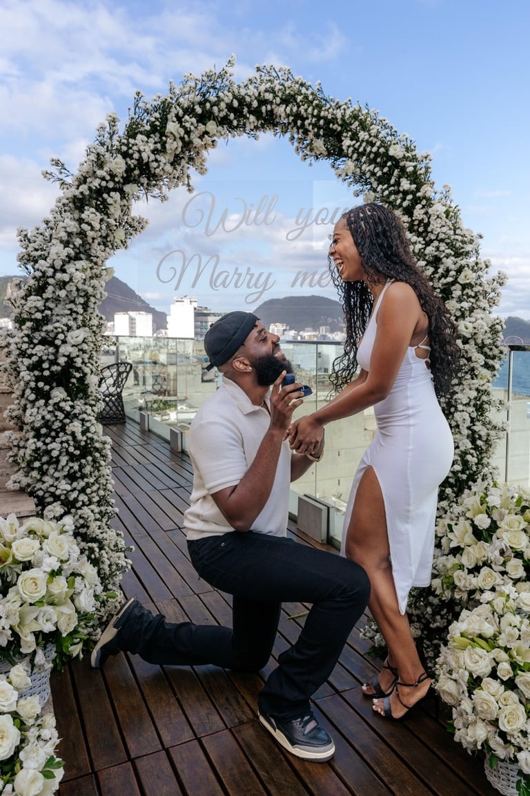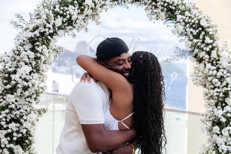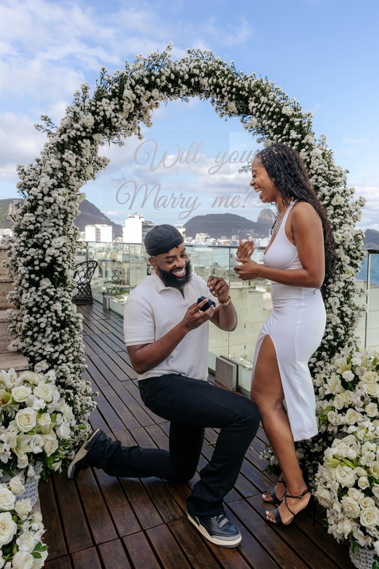 LC planned a surprise marriage proposal in Rio de Janeiro for his love, Dhaiza, during their trip from the United States. With the help of our team, every detail was carefully organized — from the rooftop location at their hotel in Copacabana to the elegant floral arch and décor. In a moment filled with love and emotion, LC got down on one knee, and Dhaiza’s reaction was pure joy and surprise.