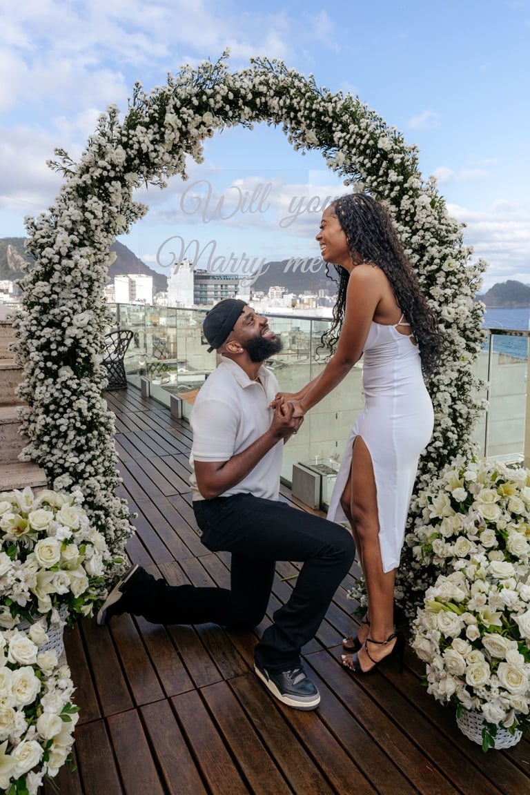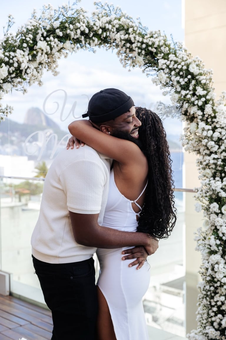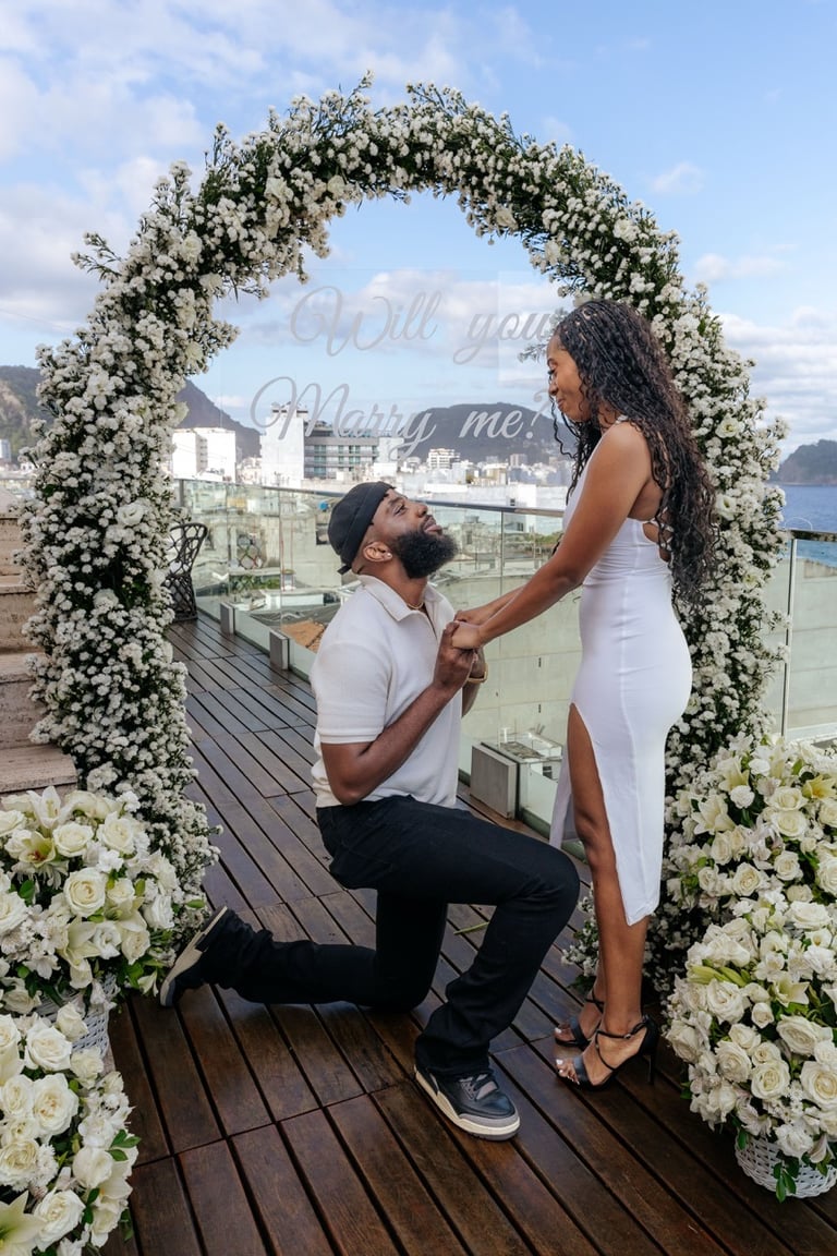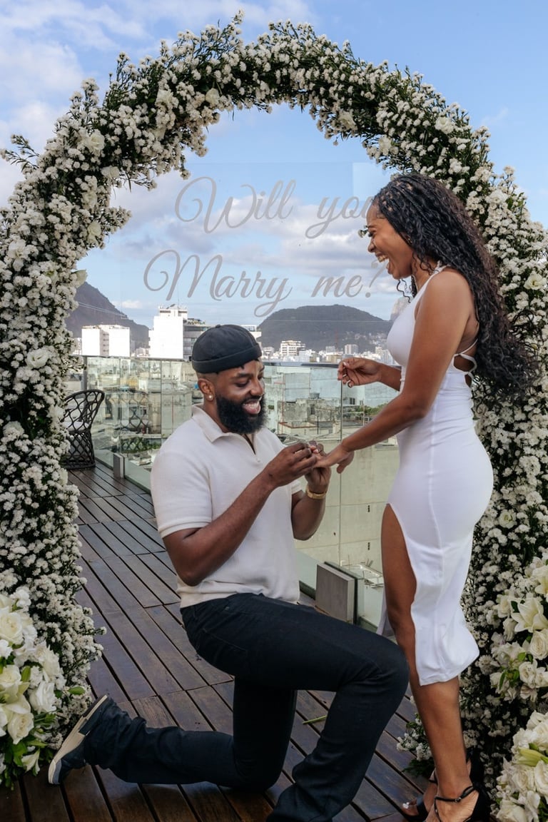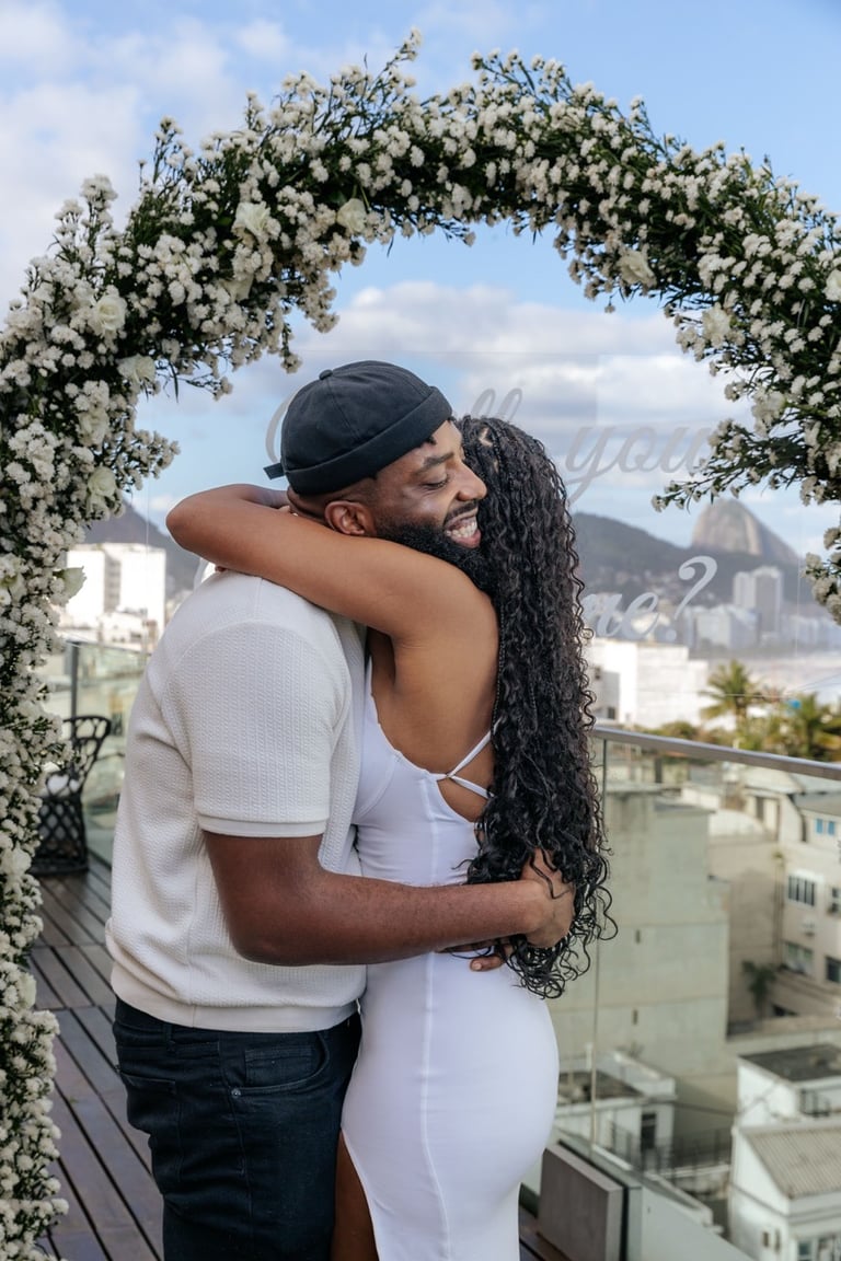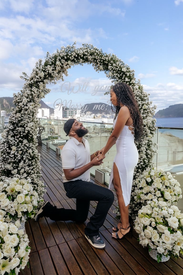 LC planned a surprise marriage proposal in Rio de Janeiro for his love, Dhaiza, during their trip from the United States. With the help of our team, every detail was carefully organized — from the rooftop location at their hotel in Copacabana to the elegant floral arch and décor. In a moment filled with love and emotion, LC got down on one knee, and Dhaiza’s reaction was pure joy and surprise.