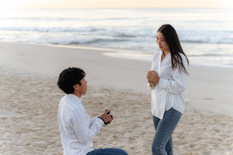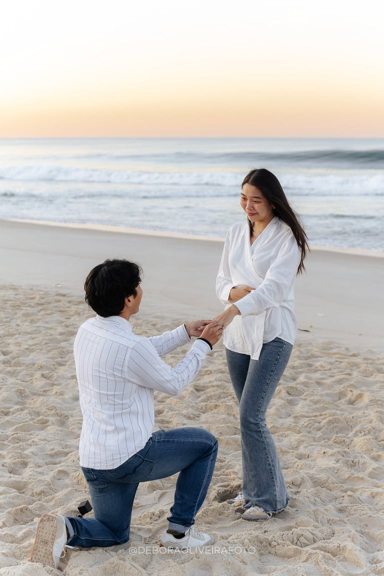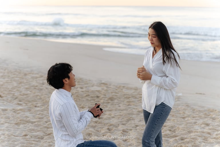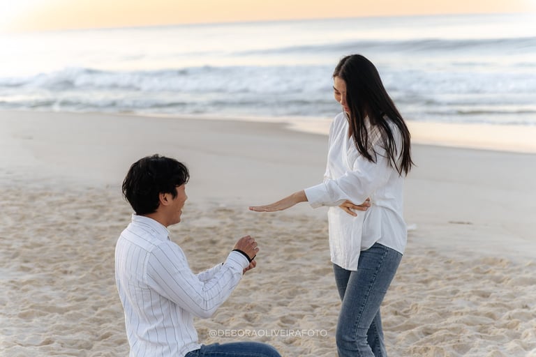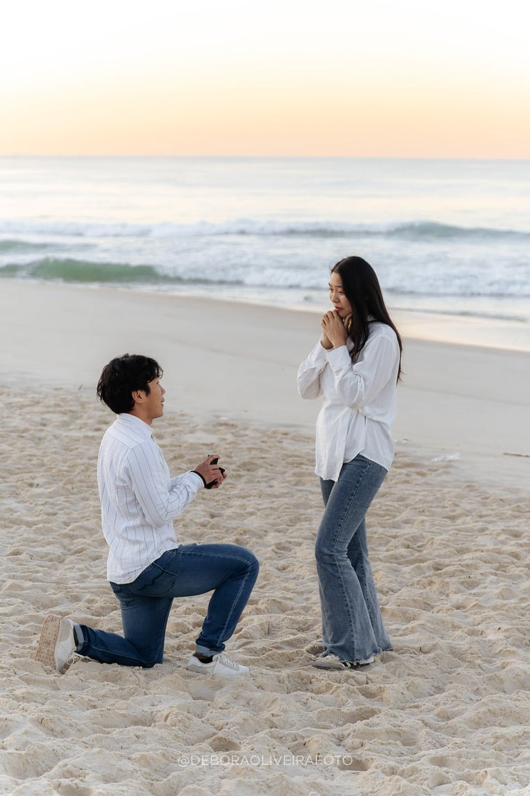Alejandro planned a romantic marriage proposal at Praia da Reserva in Rio de Janeiro during sunrise, just the two of them, in the quiet beauty of the early morning. With soft golden light, empty sands, and the sound of the waves, the moment felt intimate and magical. Kuilen’s reaction was pure joy, and we captured every second of this unforgettable sunrise beach proposal in Rio, a perfect start to a new chapter in their love story.