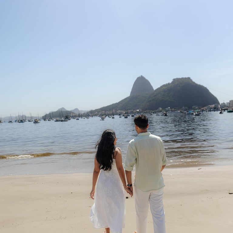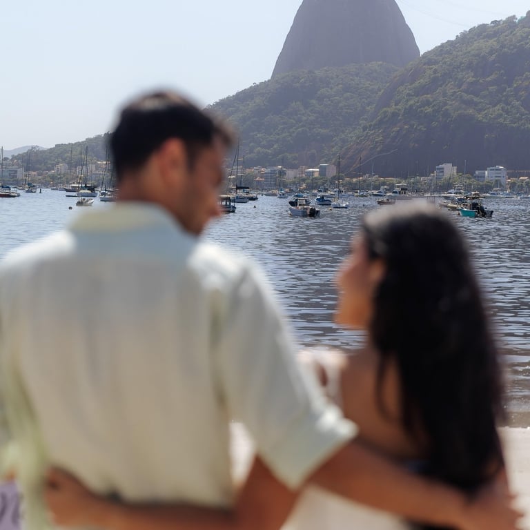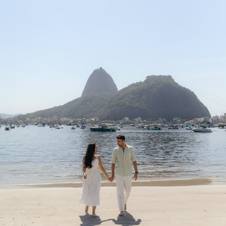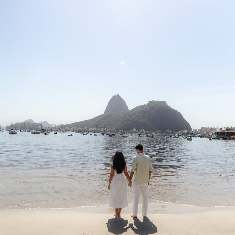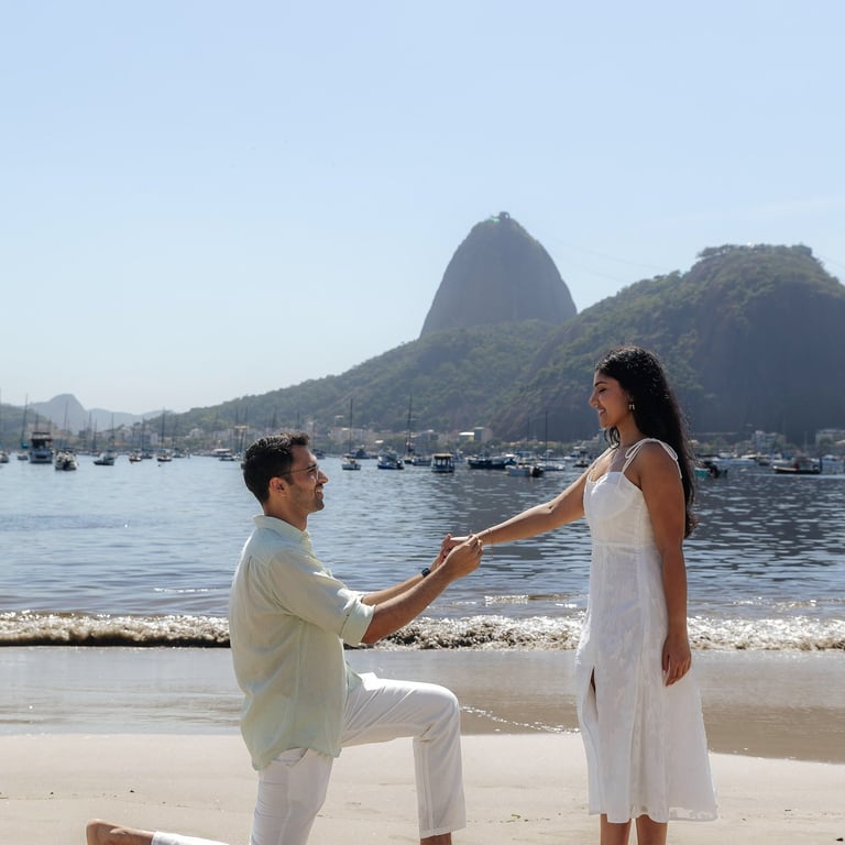Com o visual do Cristo Redentor e do Pão de Açúcar ao fundo, o cenário trouxe ainda mais significado para o momento. Após o pedido, realizamos uma sessão de fotos completa pela praia e arredores, registrando cada reação, sorriso e detalhe desse início de nova fase.