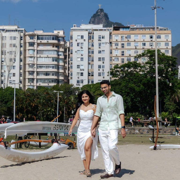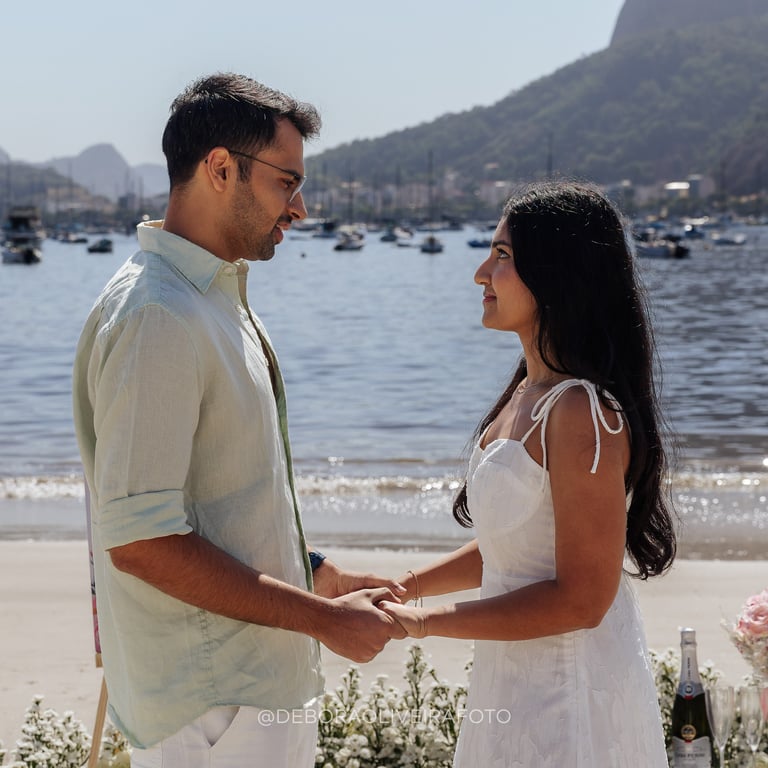 O pedido de casamento de Aishwarya e Apoorva aconteceu na Praia de Botafogo, no Rio de Janeiro, com uma das vistas mais icônicas da cidade, de frente para o Pão de Açúcar e a Baía de Guanabara. A escolha do local trouxe um equilíbrio perfeito entre praticidade e um cenário marcante, ideal para um momento tão especial.