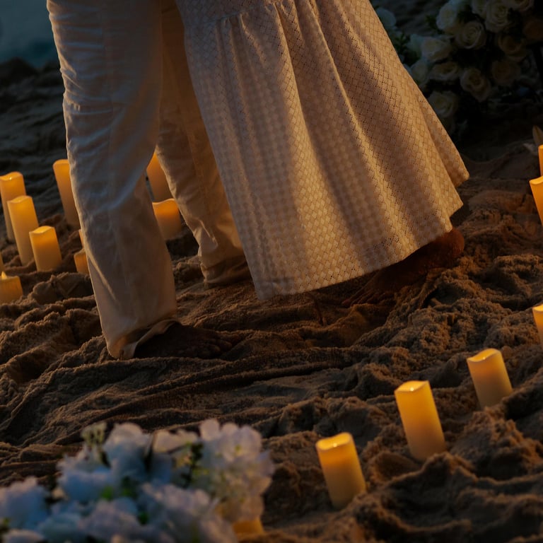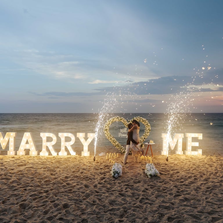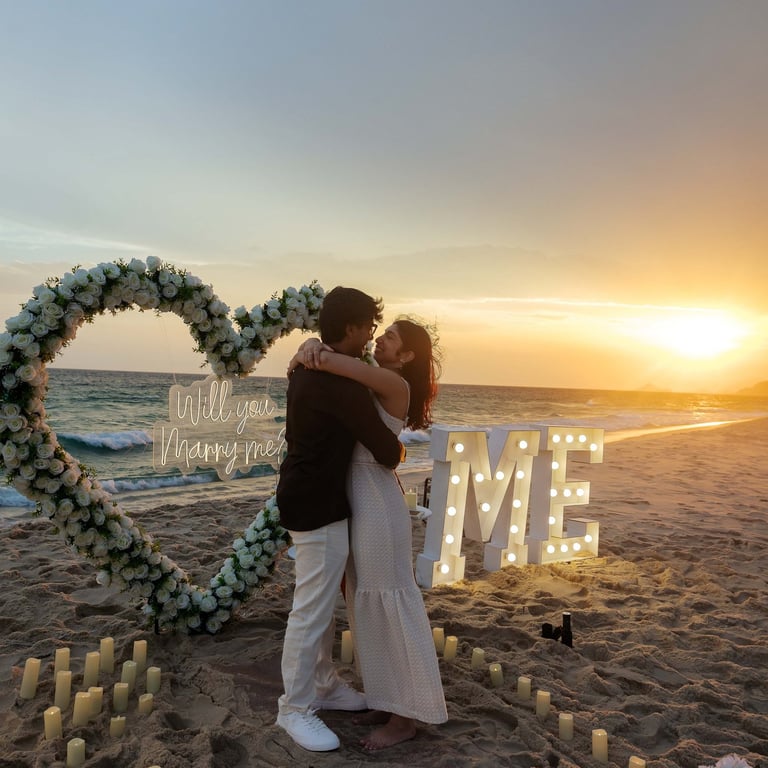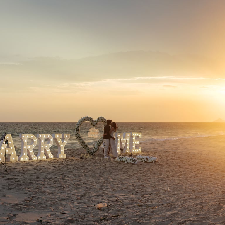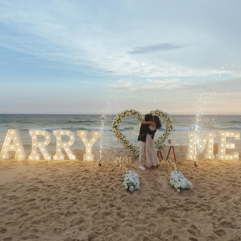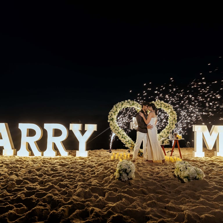 Surrounding the proposal area, dozens of candles were placed in the sand, creating a warm and intimate glow as the daylight slowly faded. Large illuminated letters spelling “Marry Me” completed the decoration and made the proposal scene feel even more special. The combination of flowers, candles, soft lighting and the ocean view created a breathtaking setting for a romantic marriage proposal in Rio de Janeiro.