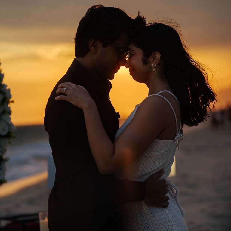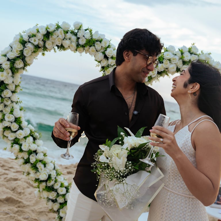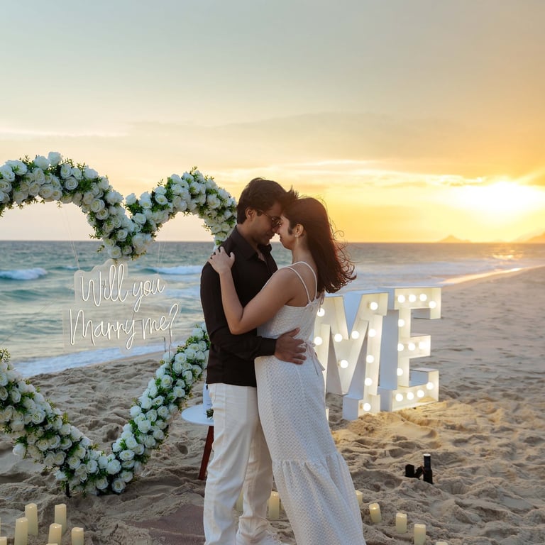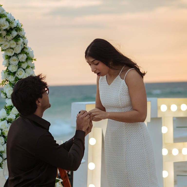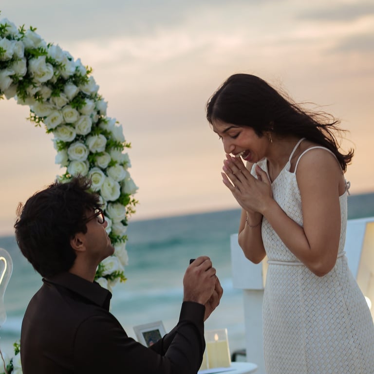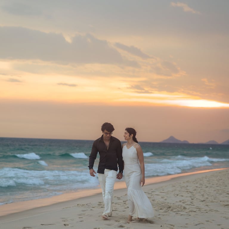 For Sunil and Kiran, the idea was to create a romantic beach proposal in Rio de Janeiro that felt elegant, private and visually stunning. The proposal took place at sunset, when the light becomes soft and warm and the ocean creates the perfect natural backdrop for such an important moment.