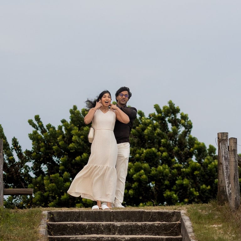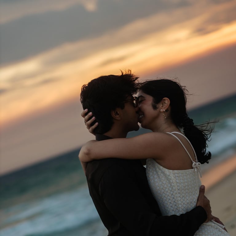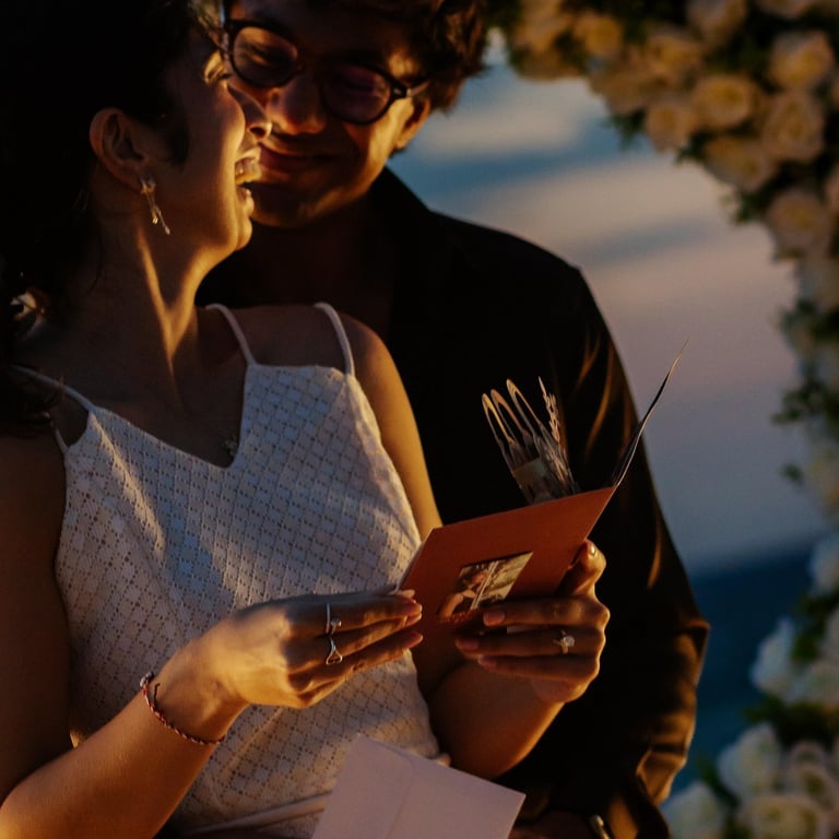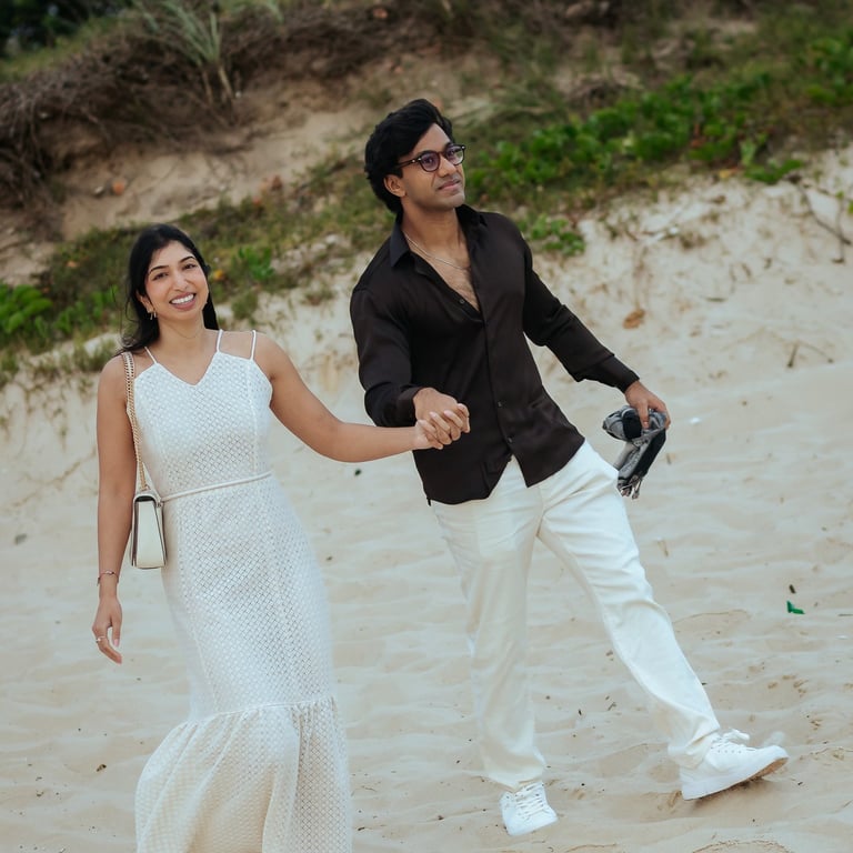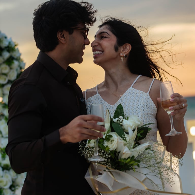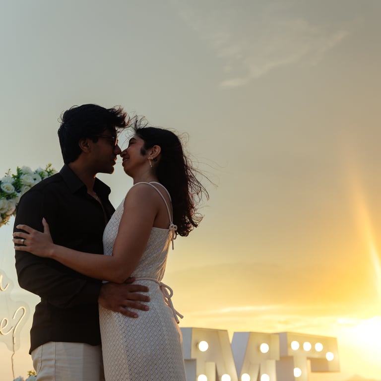 For Sunil and Kiran, the idea was to create a romantic beach proposal in Rio de Janeiro that felt elegant, private and visually stunning. The proposal took place at sunset, when the light becomes soft and warm and the ocean creates the perfect natural backdrop for such an important moment.