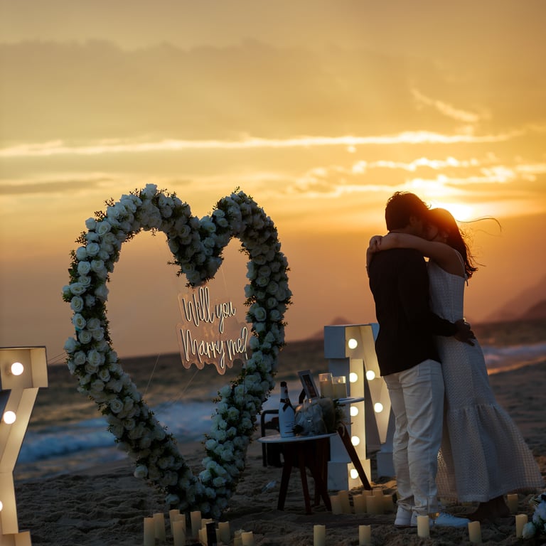 A romantic beach marriage proposal in Rio de Janeiro is one of the most unforgettable experiences for couples visiting the city. The combination of ocean views, golden sunset light and a carefully designed setup with flowers, candles, music and special effects creates a moment that feels both intimate and spectacular. From floral arches and illuminated letters to live music, cold sparkles and professional photo and video coverage with drone, every detail can be designed to create a truly unique proposal experience.