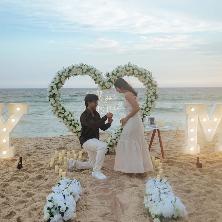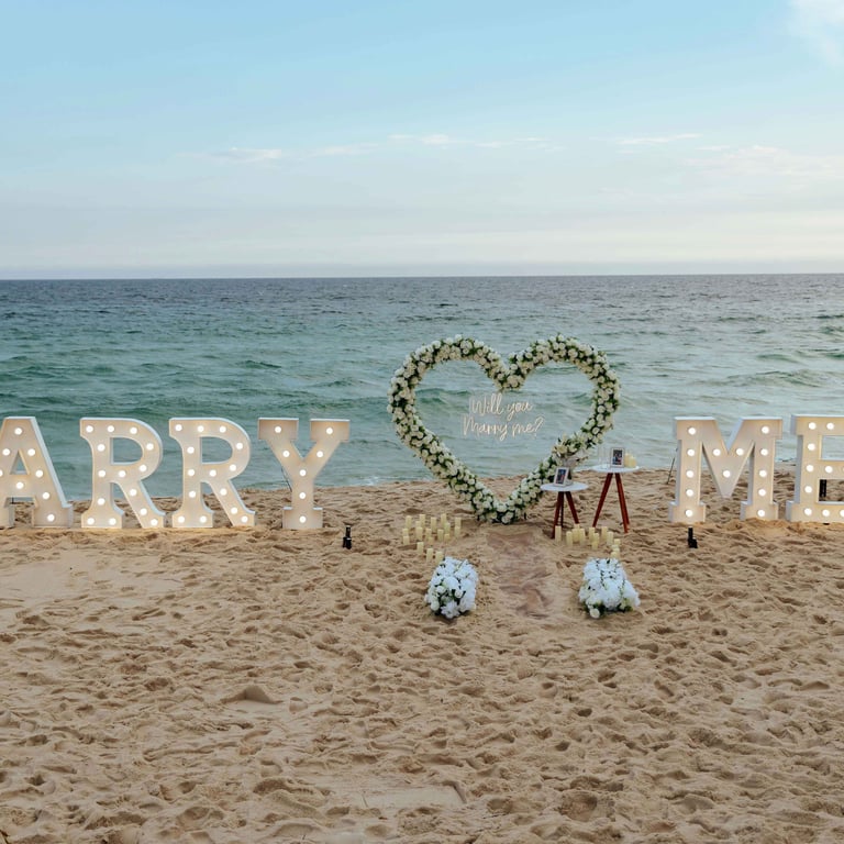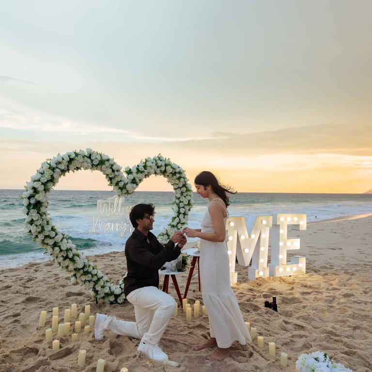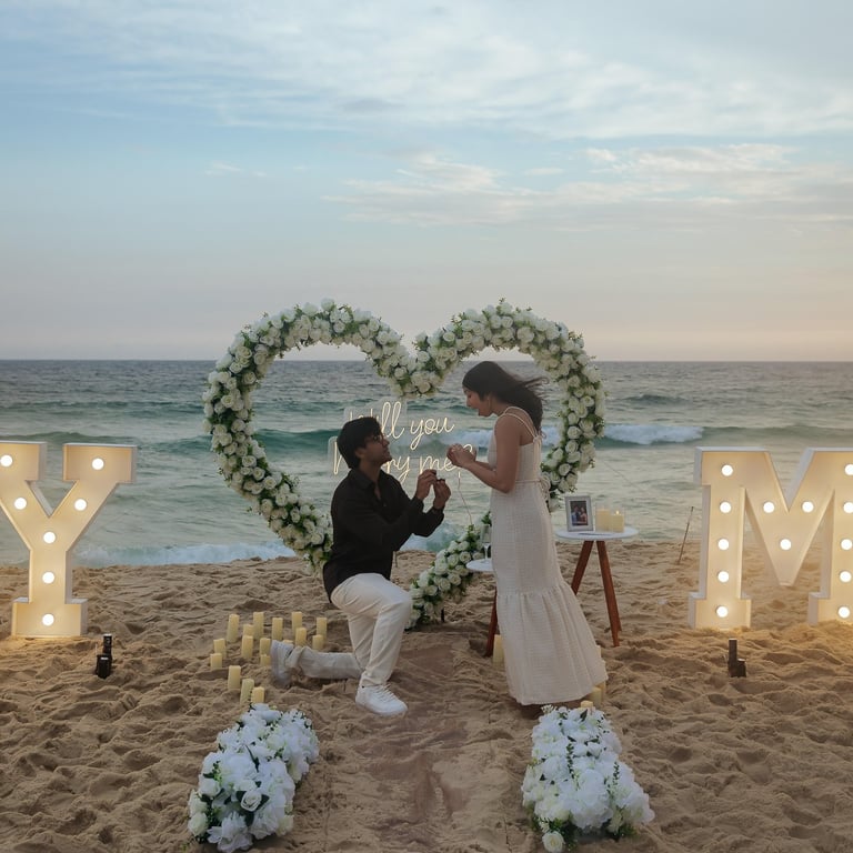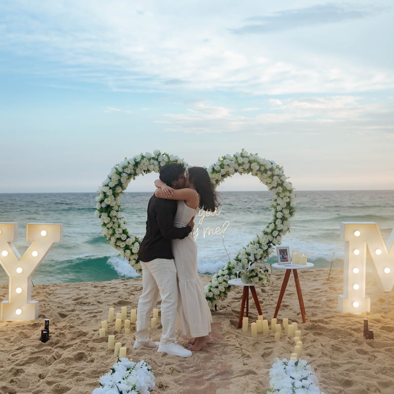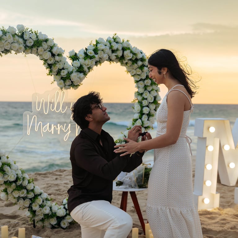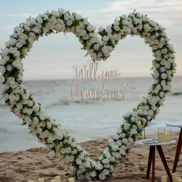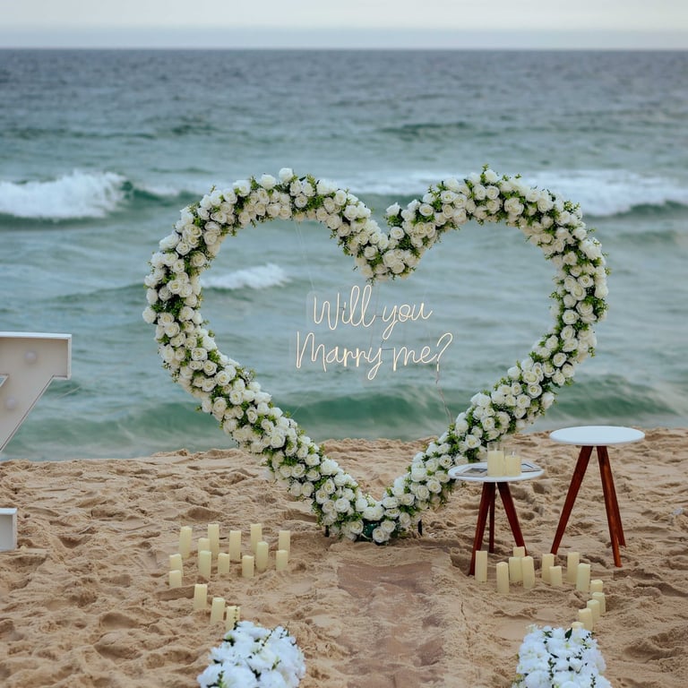 The entire setup was designed to create a romantic atmosphere directly on the sand. In the center of the space, a large floral heart arch made with white roses framed the ocean view. Suspended inside the heart was a glowing neon sign with the words “Will you marry me?”, creating the focal point of the proposal and making the moment even more magical as the sun started to set over the water.