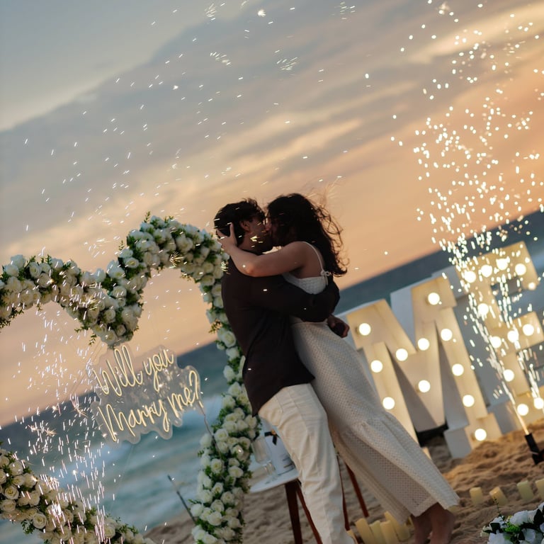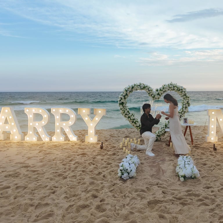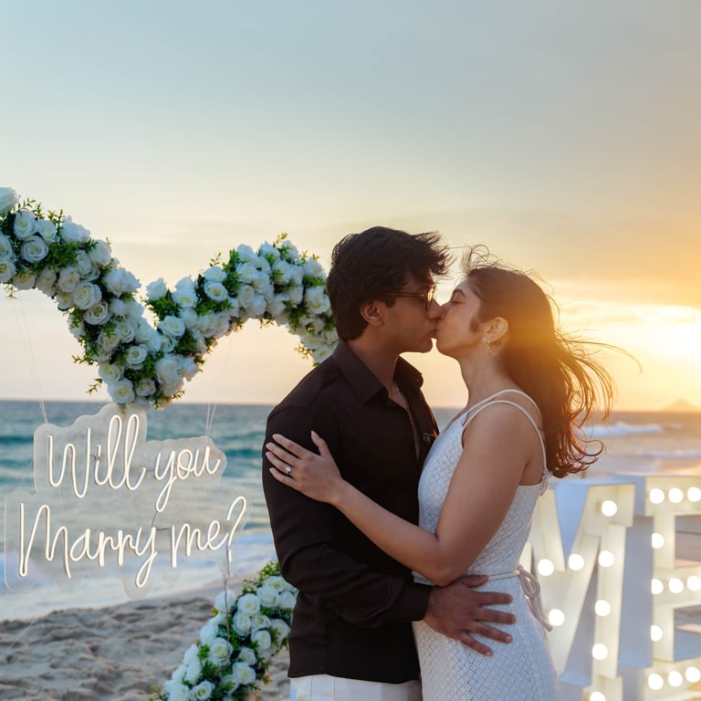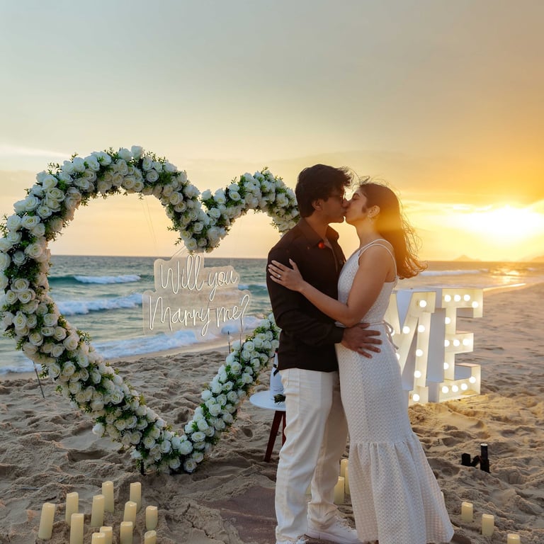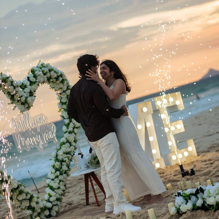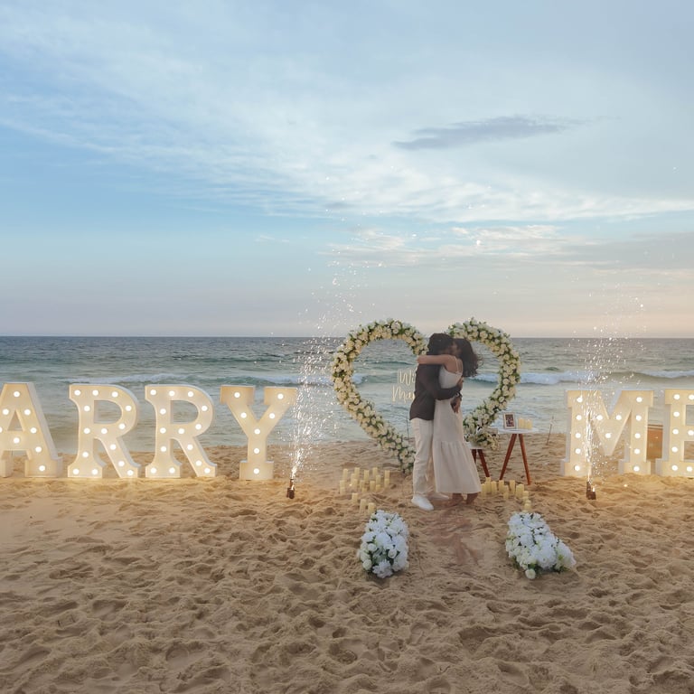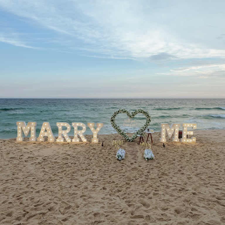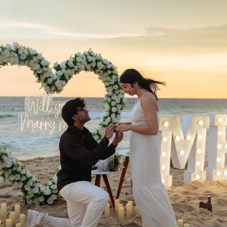 The entire setup was designed to create a romantic atmosphere directly on the sand. In the center of the space, a large floral heart arch made with white roses framed the ocean view. Suspended inside the heart was a glowing neon sign with the words “Will you marry me?”, creating the focal point of the proposal and making the moment even more magical as the sun started to set over the water.
