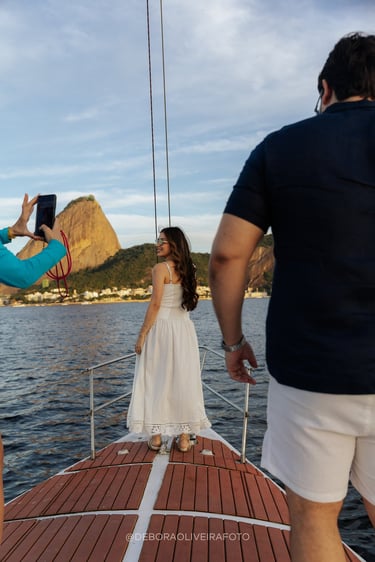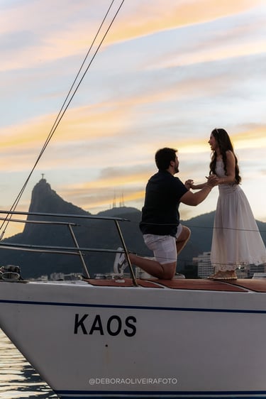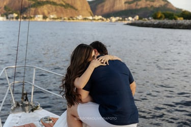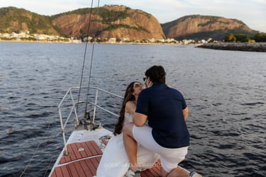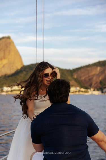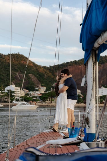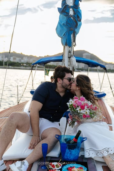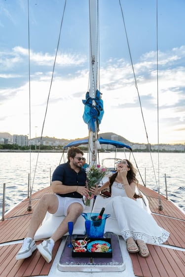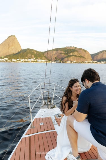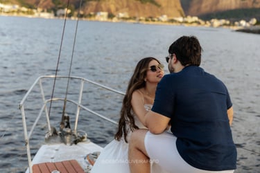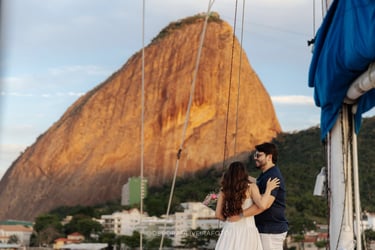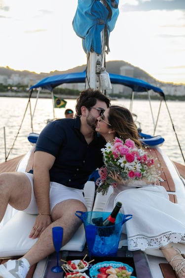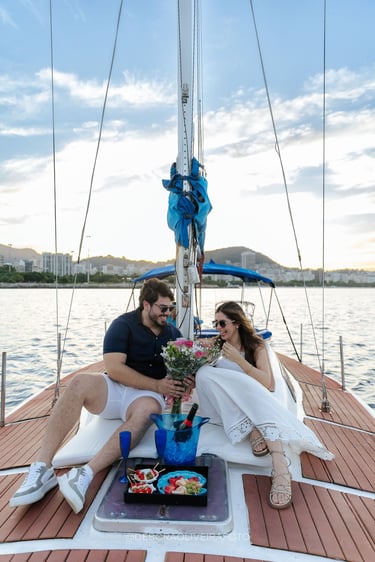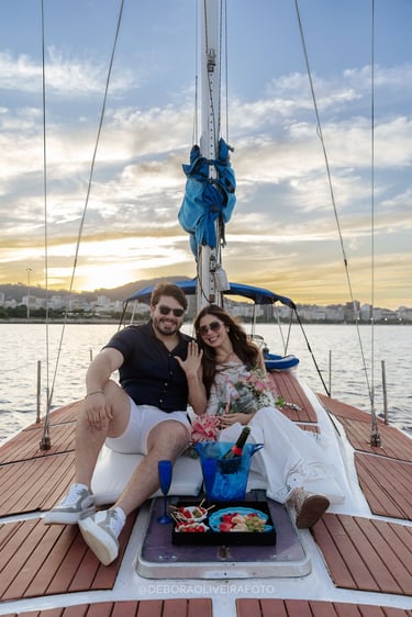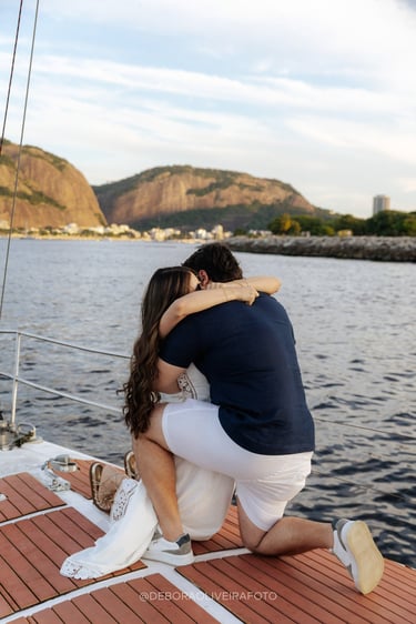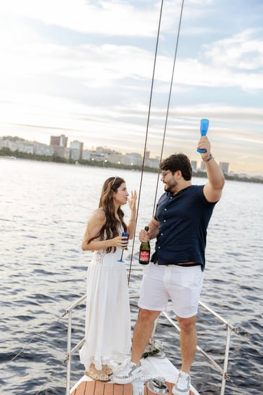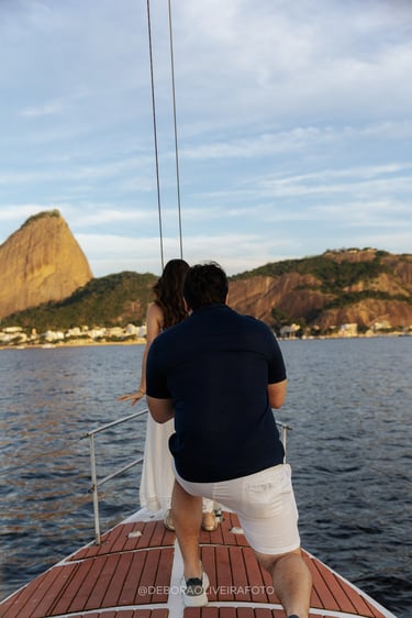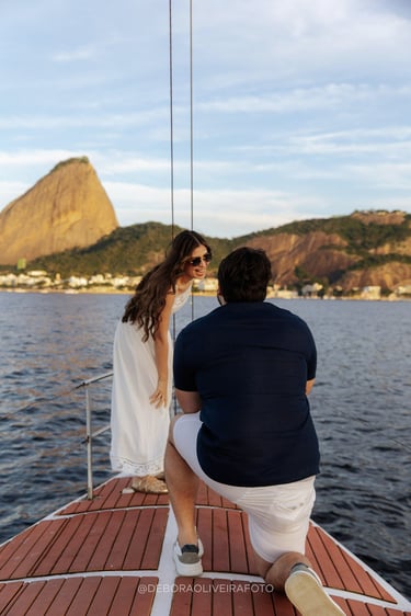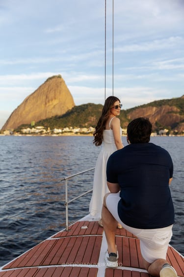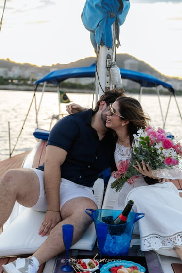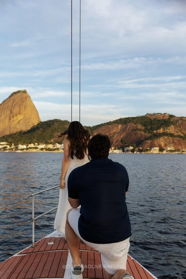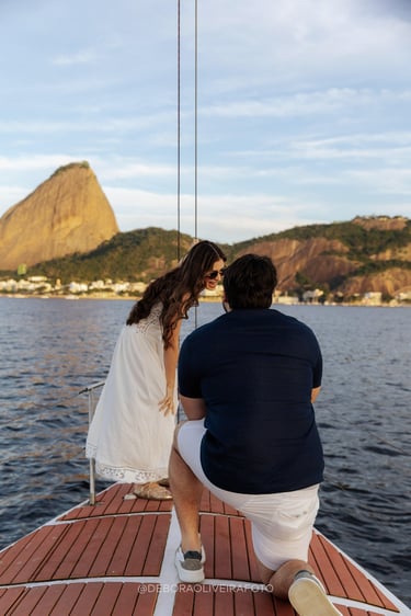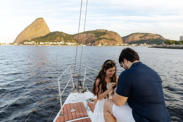That’s when he found me. We talked, shared ideas, and he chose one of the experiences I offer for surprise proposals in Rio: a private sailboat at sunset. The idea? A romantic ride through the Guanabara Bay with the city’s iconic skyline all around — and the perfect setup for a “YES”.