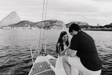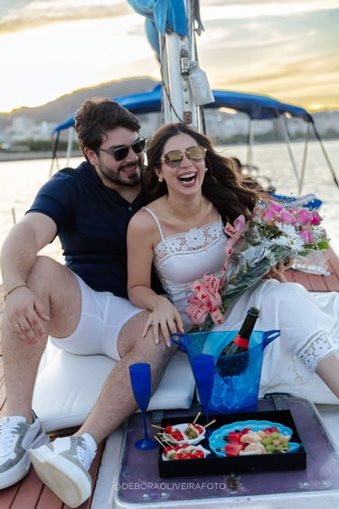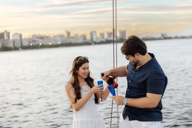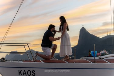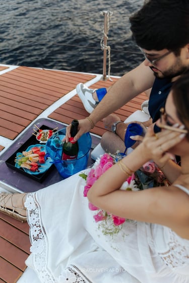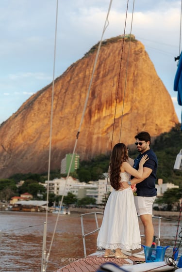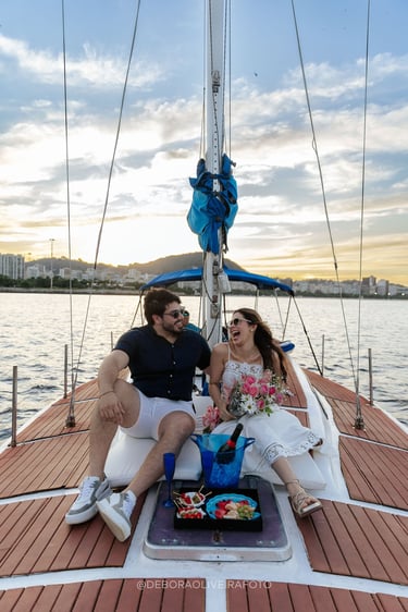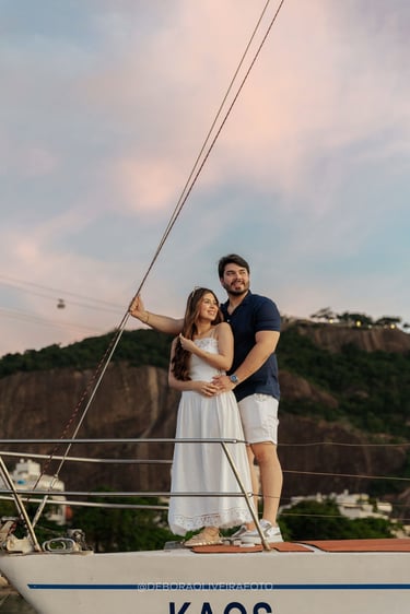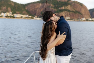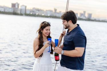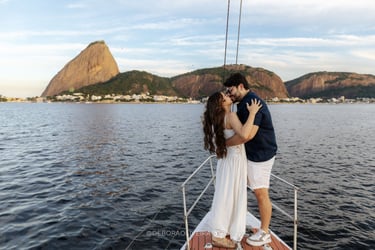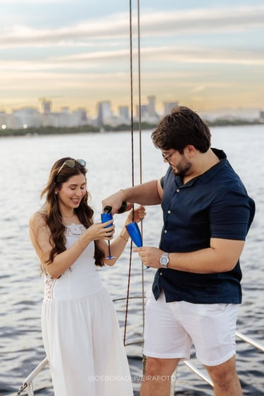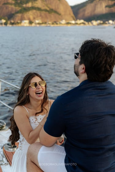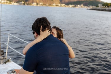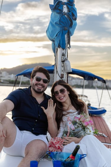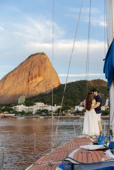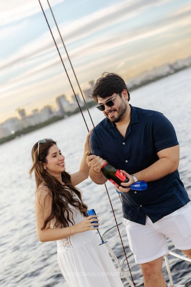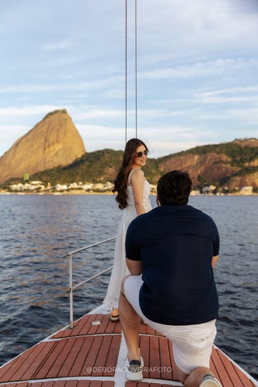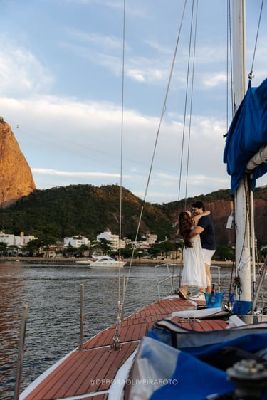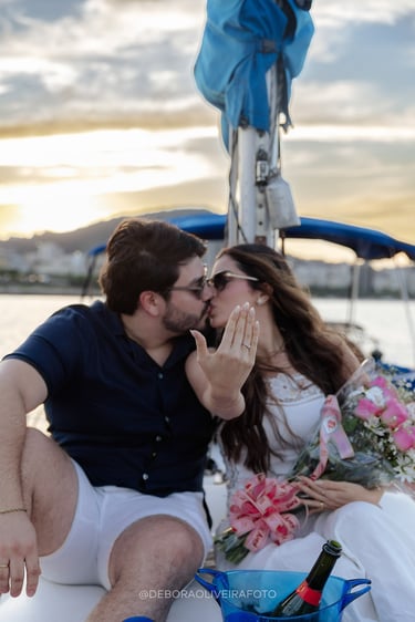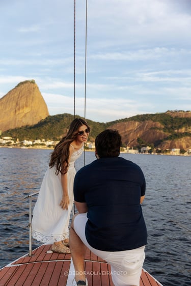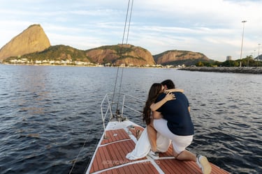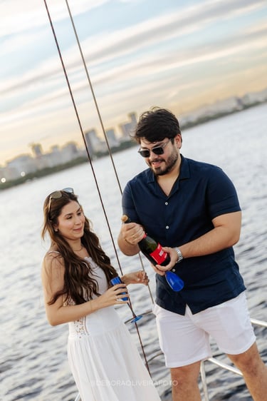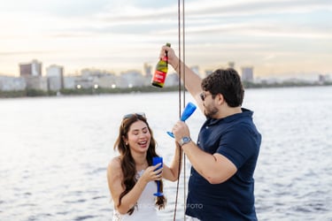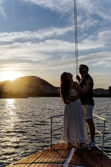 That’s when he found me. We talked, shared ideas, and he chose one of the experiences I offer for surprise proposals in Rio: a private sailboat at sunset. The idea? A romantic ride through the Guanabara Bay with the city’s iconic skyline all around — and the perfect setup for a “YES”.